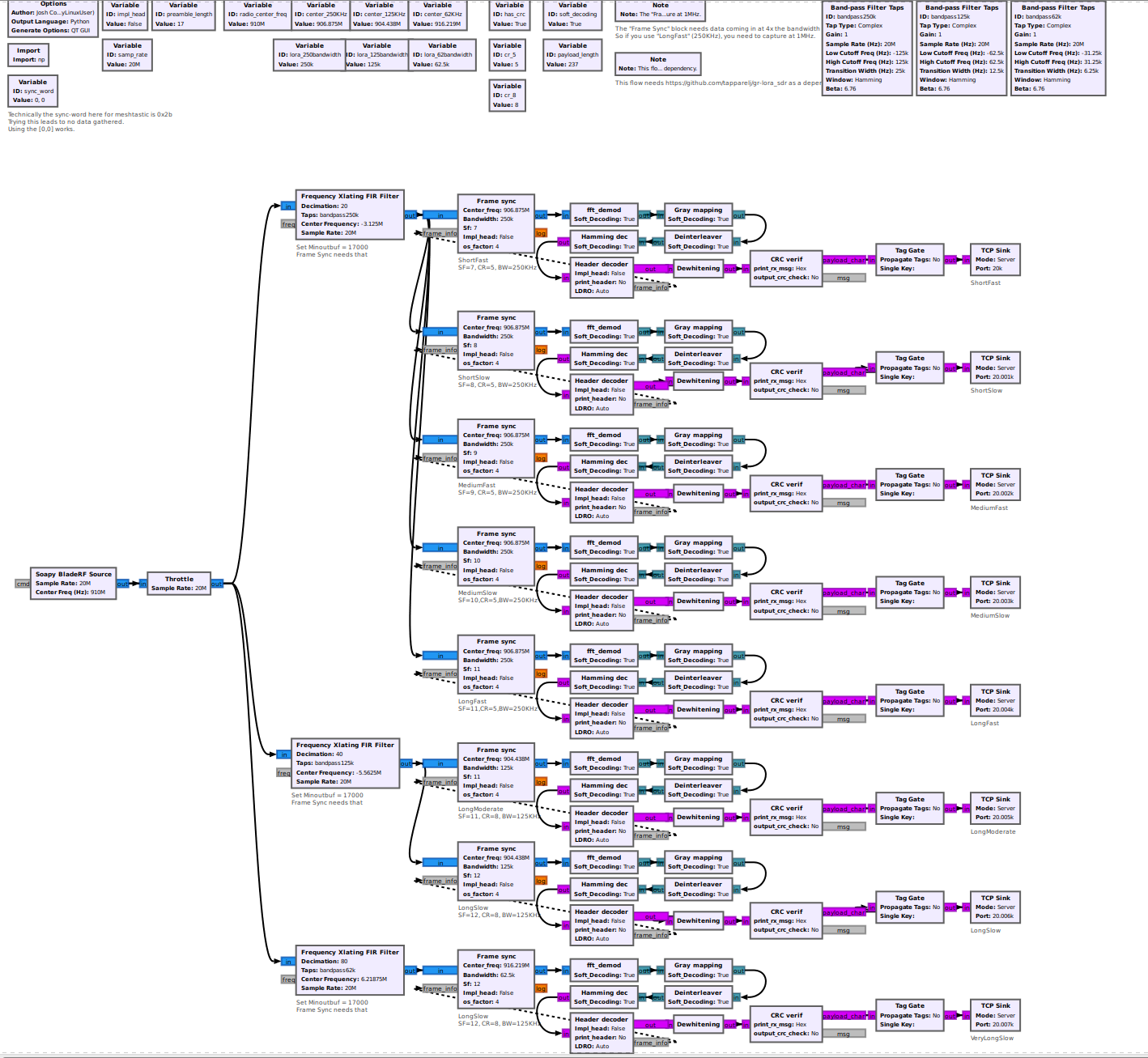 5. Open in ./meshtastic_sdr/gnuradio scripts/RX/ your relevant area and presets you want to monitor. RTLSDR can be used with all but the Meshtastic_US_allPresets.grc as that requires 20MHz (HackRF or better)
